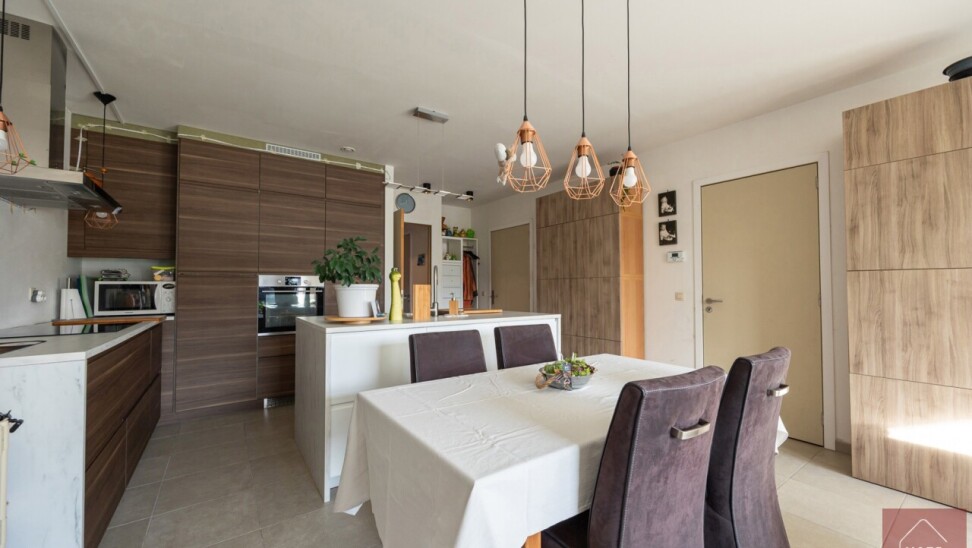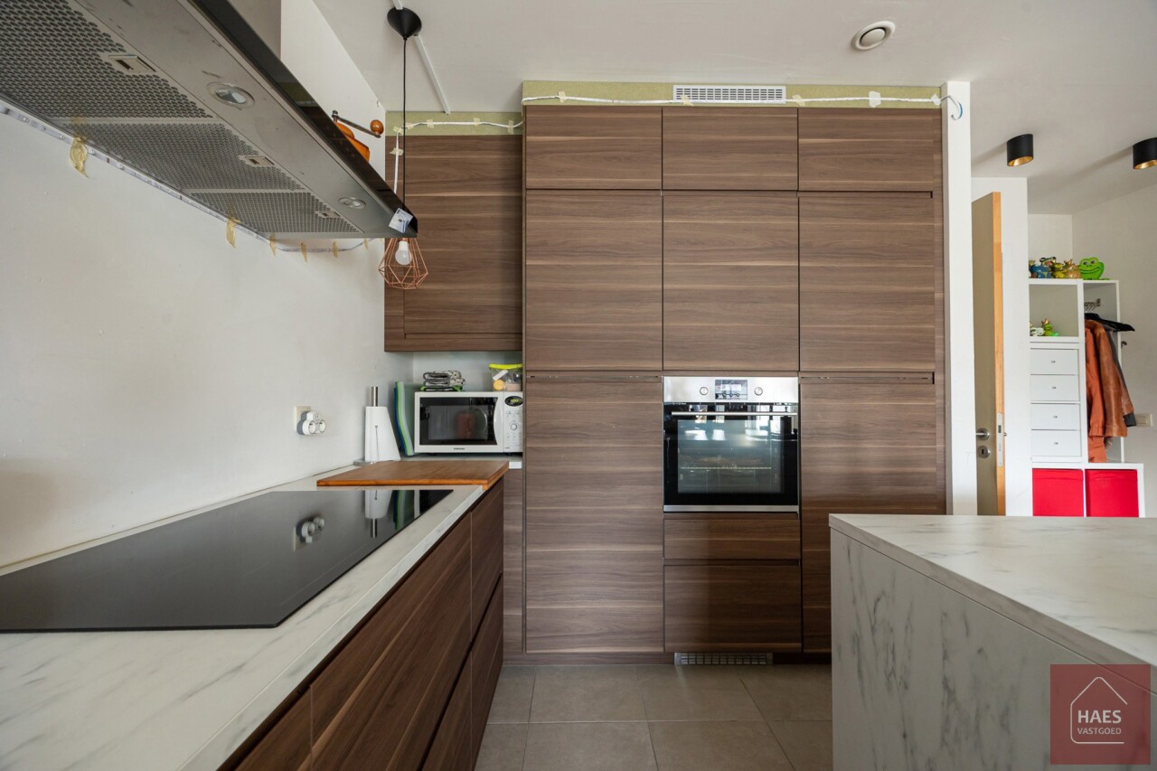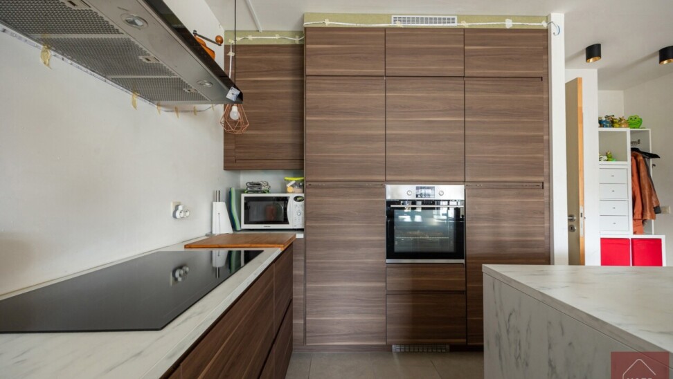 -Een open keuken met o.a. , inductie-kookvuur, oven en koelkast en aparte vrieskast. Aansluiting voor vaatwasser is aanwezig.